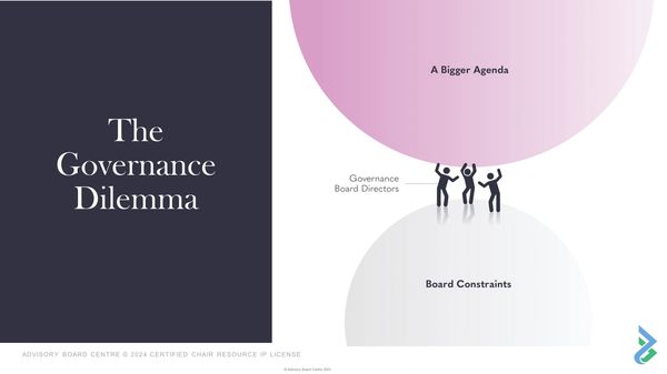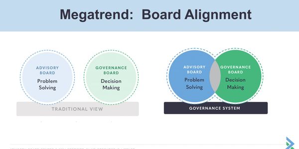In response to this challenge, the Advisory Board Centre's leading research identifies a megatrend unfolding globally, of a broadening frame of reference for the governance system. Not only of adding an advisory board to supplement the thinking system and problem solving capability and capacity. But also evolving from a traditional view of advisory boards and governance boards standing apart from one another, to a more integrated view of them being seamlessly side by side and overlapping on a continuous spectrum of a governance system. Working in unison, they have a much better fighting chance of driving the full range of conversation-flows required to be future-proofing the enterprise with the agility required.